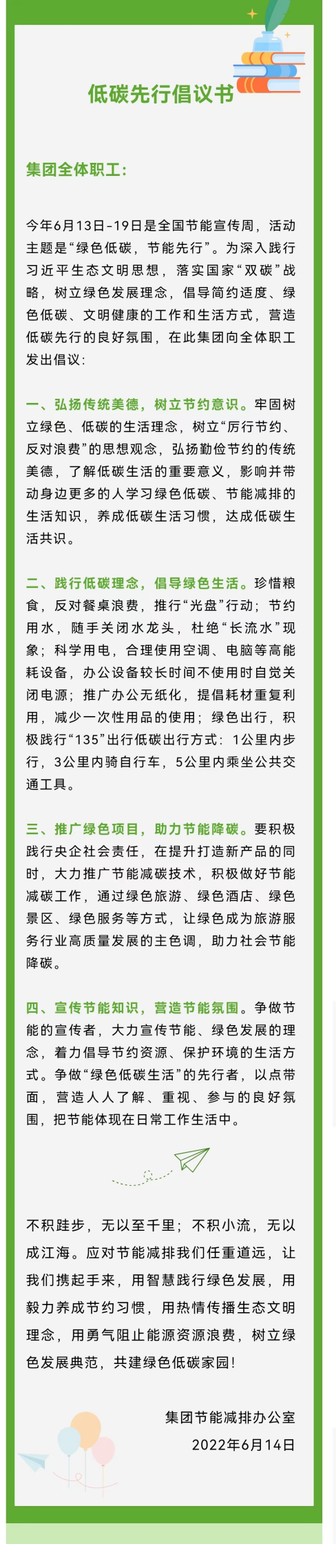 今年6月13日-19日是全國節能宣傳周,活動(dòng)主題是“綠色低碳,節能先行”。 6月14日,集團節能減排辦公室代表集團向全體職工發(fā)出低碳先行倡議書(shū)。